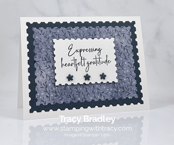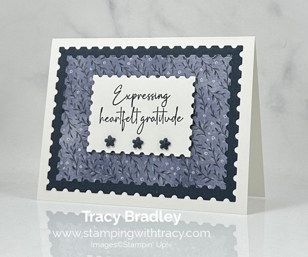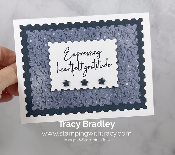 I made another card that uses Peaceful Garden Designer Series Paper. I also used the Gathering Moments Stamp Set, Perennial Postage Dies and Hues of Blue Flowers.