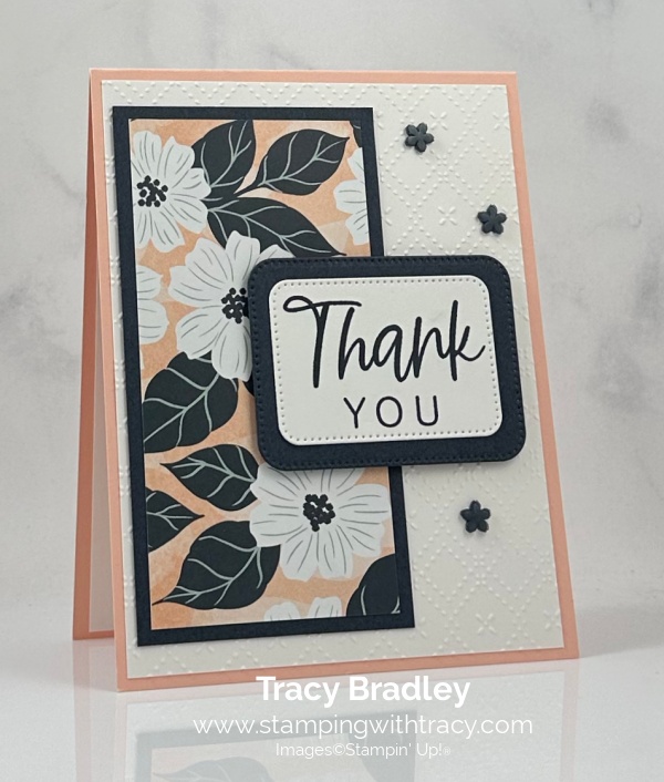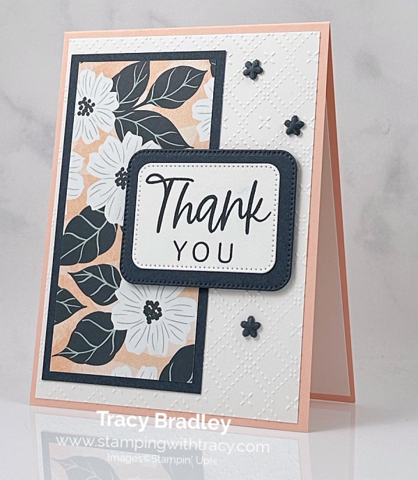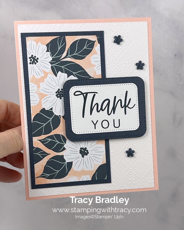 I have a thank you card for you today. I used With You in Mind Stamp Set (an Online Exclusive), Lovely Blossoms Designer Series Paper (an Online Exclusive), Beautiful Pattern 3D Embossing Folder (an Online Exclusive), Nested Essentials Dies, and Hues of Blue Flowers (moved over to Online Exclusive part of the store).