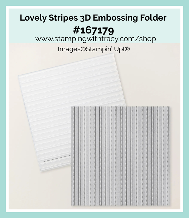 I started out with a piece of Mossy Meadow cardstock for the base of my card. Then, I embossed a piece of Basic White cardstock using the Lovely Stripes 3D Embossing Folder and my Stampin’ Cut & Emboss Machine. I adhered the embossed cardstock to the front of the card.