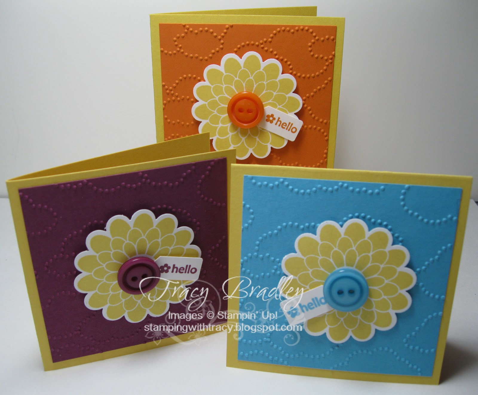 Today I have more ideas for you using the stamp set Button Buddies. I made some 3×3 cards with Daffodil Delight as my base as well as my flower. My different mats are Rich Razzleberry, Tangerine Tango and Tempting Turquoise. My hello is from the set Tiny Tags and then punched out with the Jewelry punch. I used the new embossing folder called Cloudy Day. It is so cute!