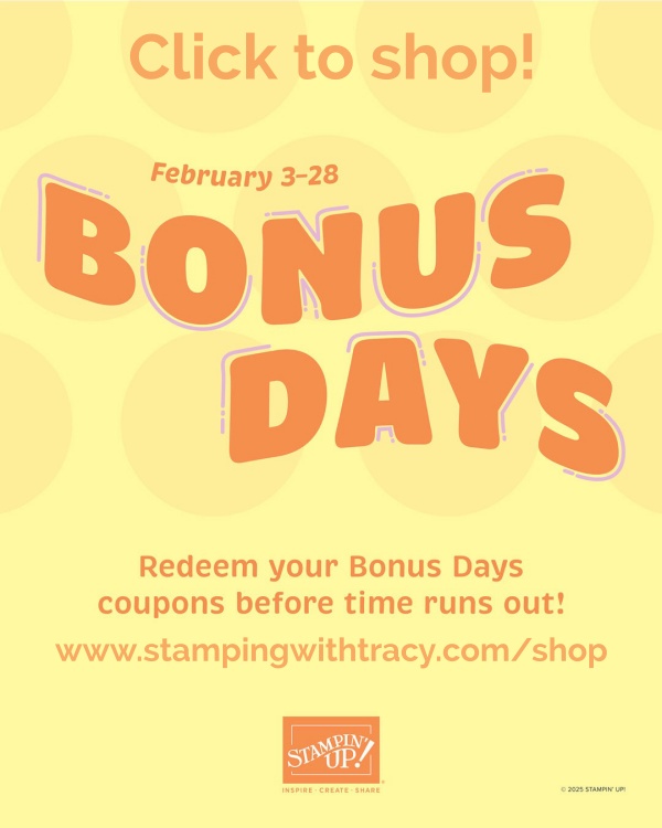 It’s a big day in the Stampin’ Up! World, the Last Chance List has been updated, the join offer is now live and you can now redeem your Bonus Days coupons. I’m still sick but I will have a card for you tomorrow.