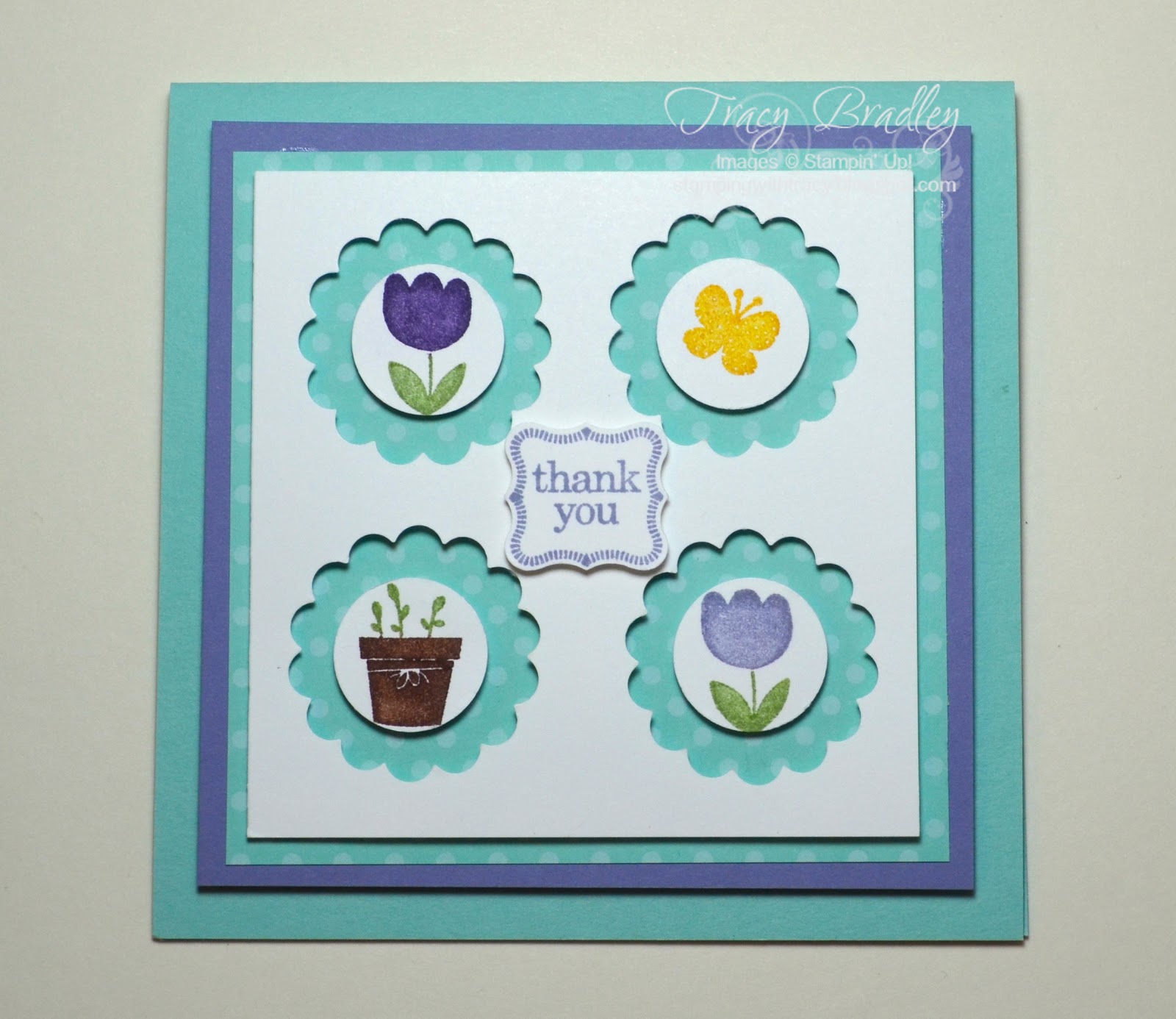 I used two stamp sets for my flowers, flower pot and butterfly. The butterfly came from A Fitting Occasion in the Annual catalog and the other cuties came from Spring Sampler in the Spring catalog. The card dimensions are 4 1/4 x 4 1/4 which is a different size but will still fit in our envelopes! The openings were made using my 1 1/4 inch Scallop punch. My sentiment is a stamp set that you can get FREE with a $50 order or you could get the cute punch (or both with a $100 order) !! PLUS, for every $50 you purchase at my Online Store, your name will go on my 50/50 board and you will have a chance to win $50 in Stampin’ Up! products!!
