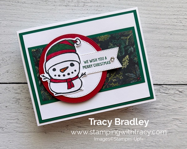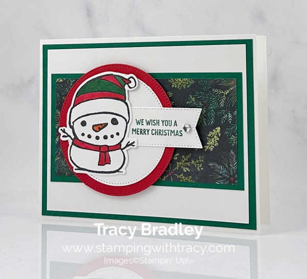 The card I’m sharing today with you uses the Festive Friends Bundle (an Online Exclusive). I did another card last Friday using the snowman, and you can see the card here. I also used Traditions of Christmas Specialty Designer Series Paper, the Branching Out Dies, and Faceted Snowflakes (an Online Exclusive).