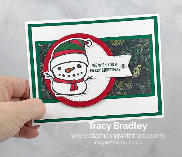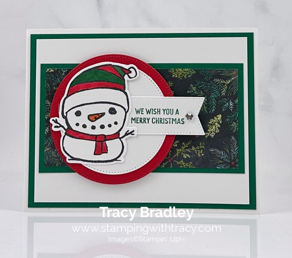 I stamped the sentiment onto Basic White cardstock using the Festive Friends stamp set in Shaded Spruce ink. I cut the sentiment out using the Stylish Shapes Dies. I first placed the sentiment where I wanted it to go and then I placed the snowman.