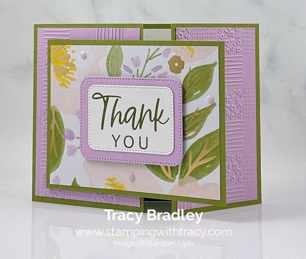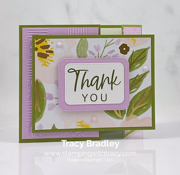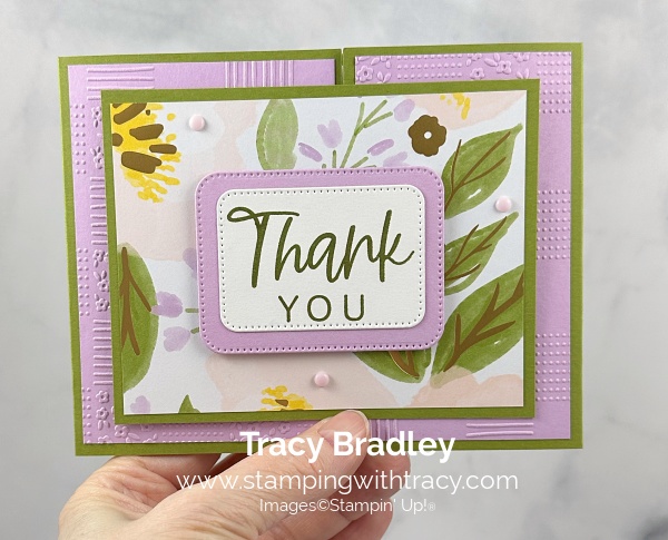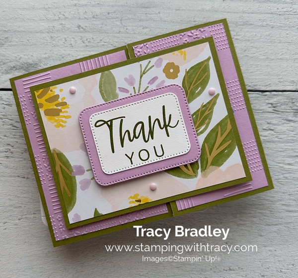 I made my thank you card using Brushed with Beauty Designer Series Paper (an Online Exclusive), With you in Mind Stamp Set (an Online Exclusive), Beautiful Pattern 3D Embossing Folder (an Online Exclusive), Nested Essentials Dies and Pearlized Faceted Circles. You can another version, here.
