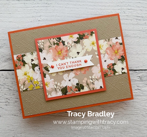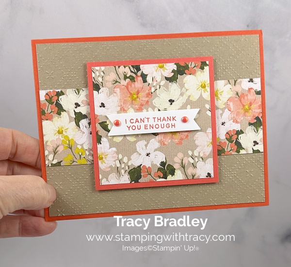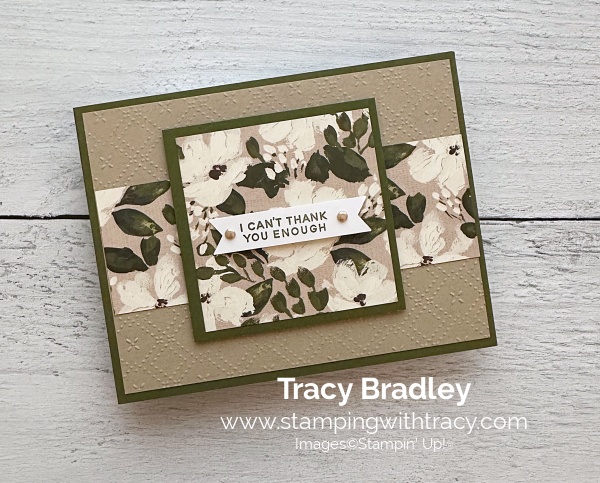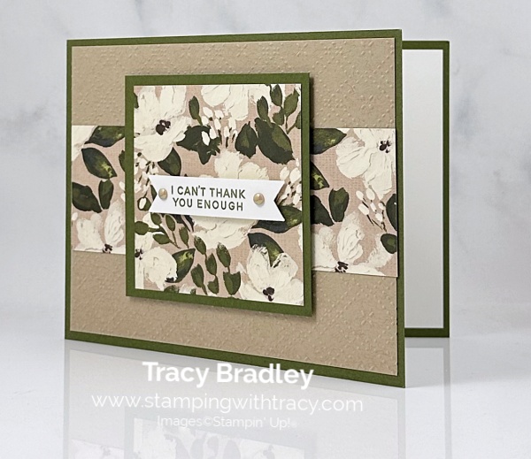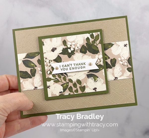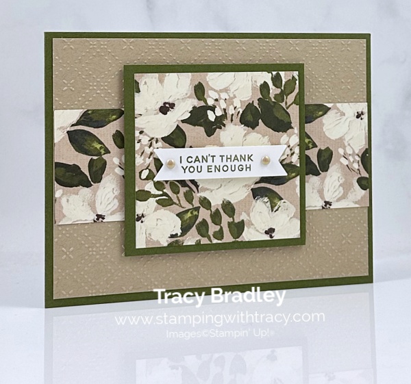 I added a piece of Brushed with Beauty Designer Series Paper (DSP) to the embossed cardstock and then adhered it to the front of the card. Next, I adhered another piece of Brushed with Beauty DSP to a piece of Mossy Meadow cardstock, added Stampin’ Dimensionals to the back and adhered it over the strip of the DSP.