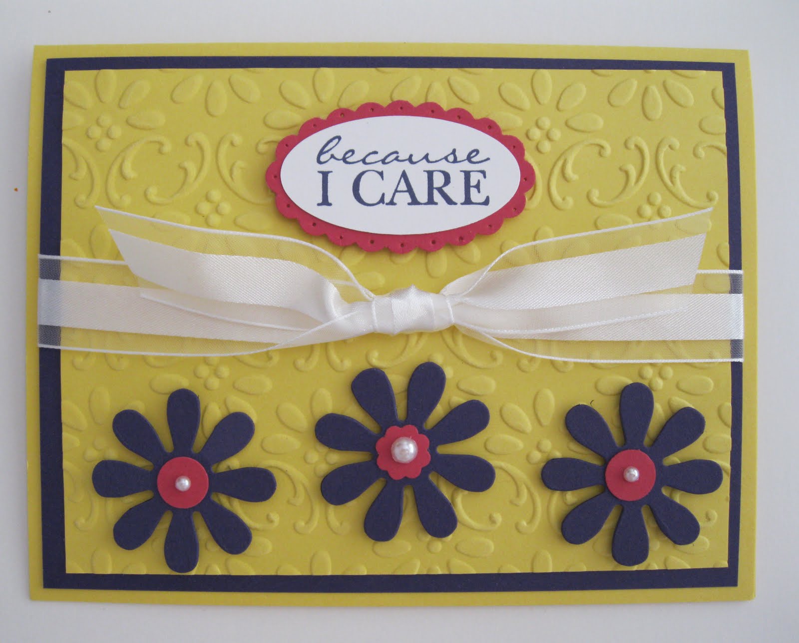 Here’s a card I made some time ago. I used my Big Shot to make the textured background and the flowers. My inspiration came from another demonstrator but I am not sure who it was. I will post my supplies later. Hope you are having a great Monday!