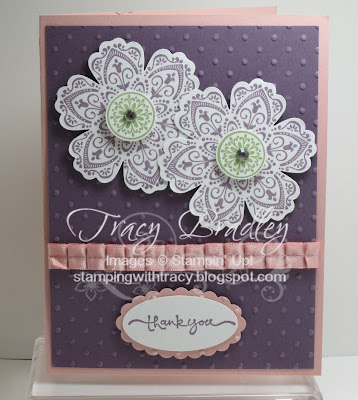 Today my card uses the new Blossom punch and Mixed Bunch stamp set. I really do love this stamp set. I used both of these new products on my Lollipop holders that I showed yesterday. I have also used our new 3/8 inch Pleated Satin Ribbon. It is a beautiful ribbon and comes in four colors. My card uses Blushing Bride but it also comes in Pear Pizzazz, Riding Hood Red and Baja Breeze. The colors that I’ve used are not ones that I normally would use (Blushing Bride and Perfect Plum) but I was happy with the results. I used a little bit of Pear Pizzazz for the center of my flowers and popped them up with a dimensional.