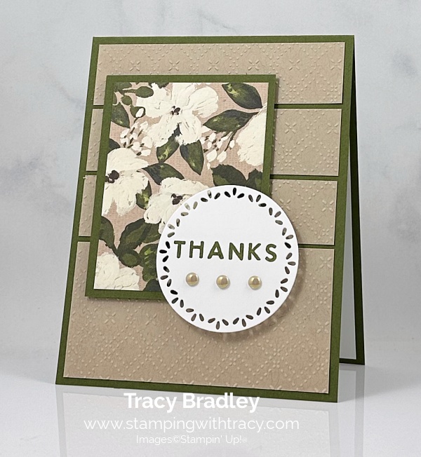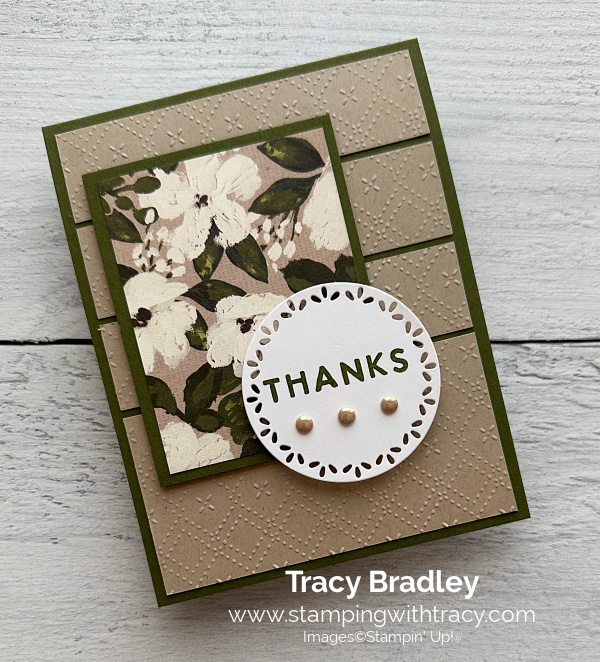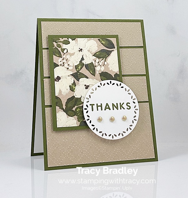 I started with a piece of Mossy Meadow cardstock for the base of my card. Then, I embossed a piece of 4″ x 5″ Crumb Cake cardstock using the Beautiful Pattern Embossing Folder and my Stampin’ Cut & Emboss Machine. Next, I cut the embossed Crumb Cake cardstock, on the 4″ side, into (3) 1″ strips and one 2″ strip. I adhered the strips to the card front.