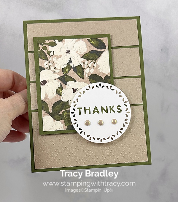 I adhered a piece of Brushed with Beauty Designer Series Paper to a piece of Mossy Meadow cardstock. Then, I added Stampin’ Dimensionals to the back and adhered it to the front of my card.