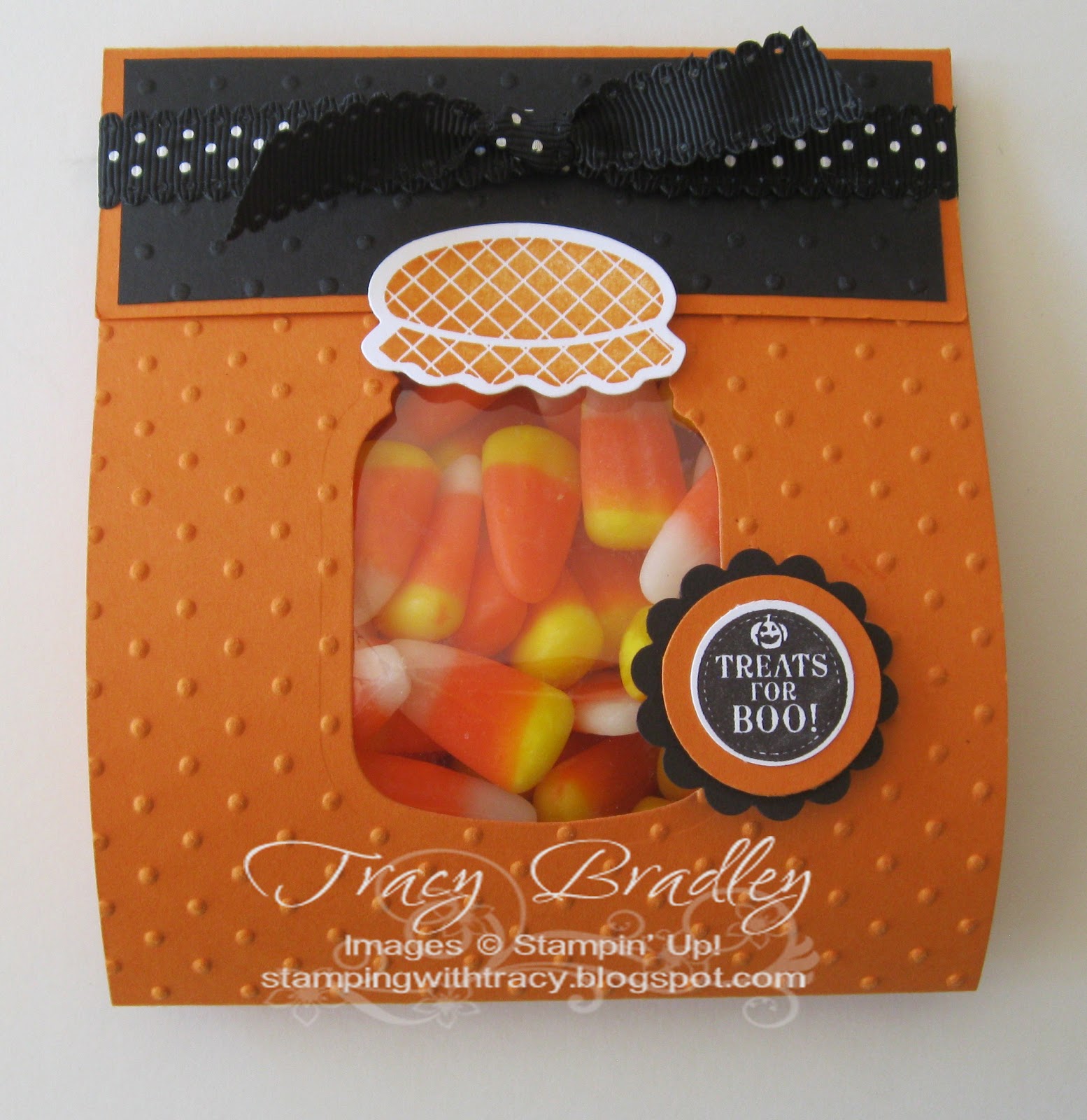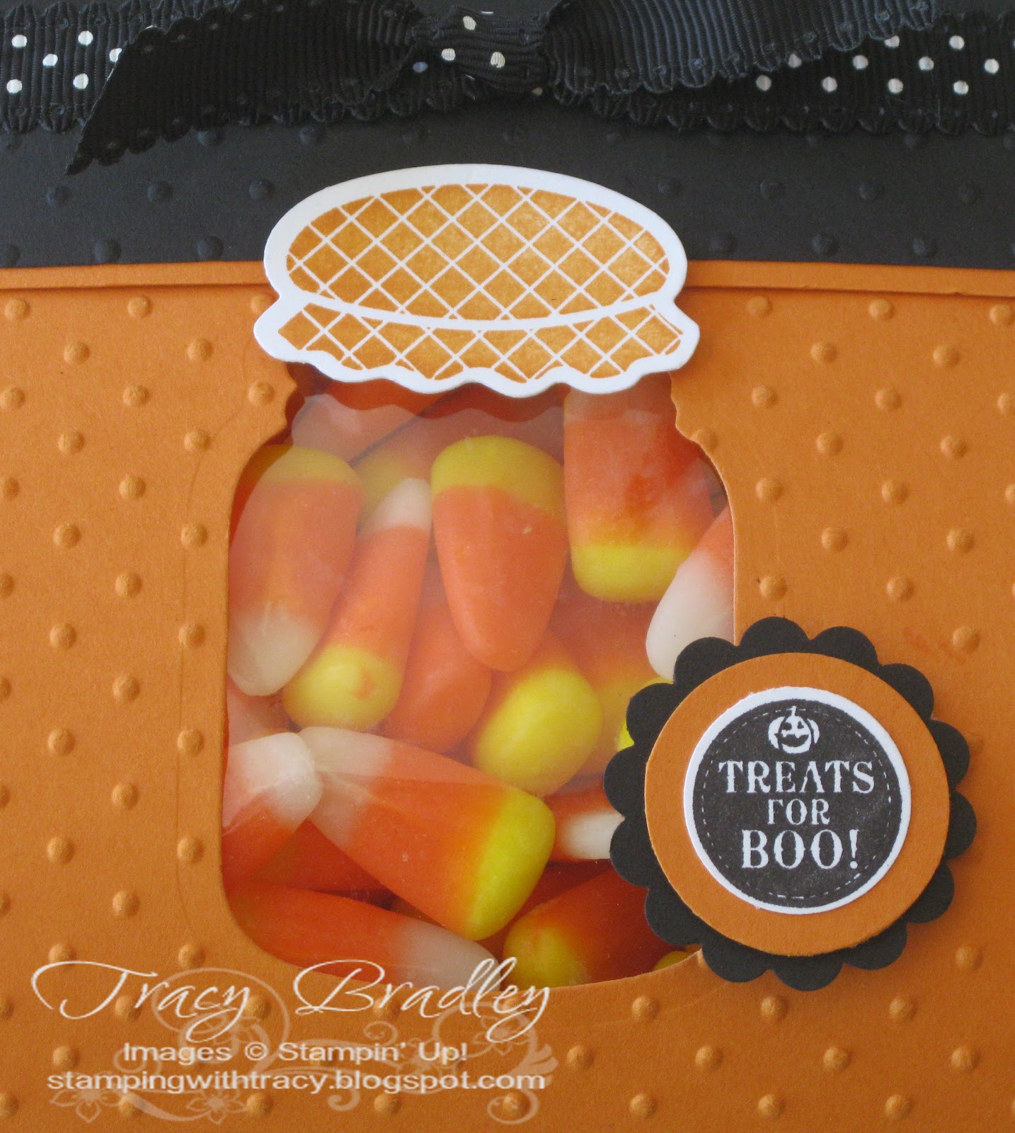Here is another project using the Perfectly Preserved Stamp Set and the Cannery Framelits. The inspiration for this came from fellow demonstrator, Monica Gale and you can see her version here. I used one of our medium cello bags for the candy corn (one for me, one for the bag, one for me .. . .). My sentiment, Treats for Boo!, comes from the Hostess Set, Mixed Medley. I LOVE this set as it has so many possibilities. You can own one too with a $150 order. You don’t need to have a party to earn this hostess set, you can earn it by placing your very own order.