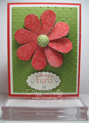 My card is one that I am giving to a friend today to thank her for several surprise gifts she has given to me recently.  Hope she likes it!  I have bling on the sentiment because she LOVES bling!! This was a very easy card to put together.  The hardest part was figuring out what colors I wanted to use.  The flower was made using my Heart punch and the Everyday Enchantment DSP (if you are in my Hostess Club, we are going to make one of these flowers at our next meeting).  Did you notice the cute fabric covered brad in the middle??  It is a sneak peek and you’ll be able to order it on April 1st!!! On Wednesday I will have the same card but with different colors and paper so be sure to stop by!
