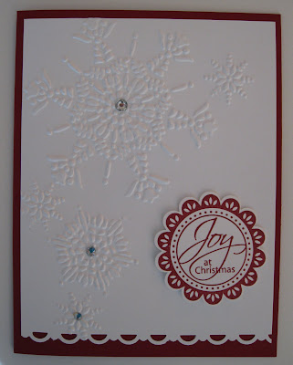 Here is another Christmas card I made. I based my card on a card I saw in the Holiday Mini on page 15. I made a few changes and used Garden Green with Cherry Cobbler. I always like to use my embossing folders with my Big Shot and used it this time on the Cherry Cobbler and Whisper White. I also used the new Decorative Label punch on page 25 in the mini. Hope this inspires you to stamp today! Thanks for stopping by!