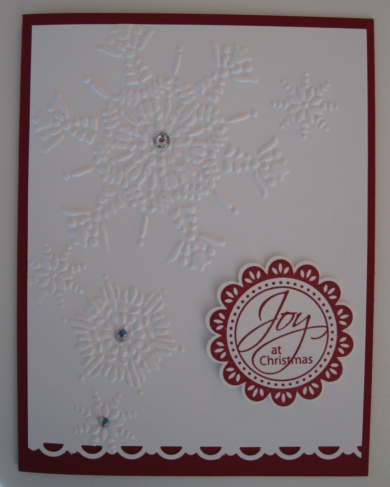 This card is a little bit difficult to see in the picture but it is VERY pretty in person. It was very simple to make but really looks very elegant. The Northern Flurry textured impressions folder (can be found on page 26 in the Holiday Mini) transorms plain cardstock to a beautiful background! I added a few rhinestones in the center of three snowflakes. I used the Perfect Punches set for my sentiment and punched it out with my 1 3/4 inch scallop punch! I popped it up with Stampin’ Dimensionals! The inspiration for this card came from Pennie McCallum.
