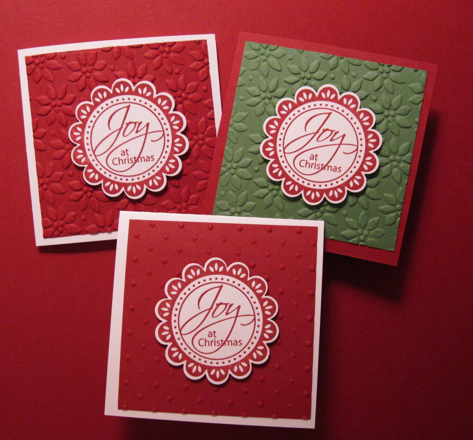 I’ve been making a large amount of 3×3 cards to take with me to a Holiday Boutique on Saturday. I think they turned out cute and were very easy to make. I used two of my Big Shot embossing folders: Perfect Polka Dots and Petals a Plenty. I used the Perfect Punches stamp set which is really one of my favorites. I punched the sentiment out with my scallop punch. The entire stamp set coordinates with a punch. I love that! If you have any questions or would like to place an order, please email me! I’d love to hear from you!