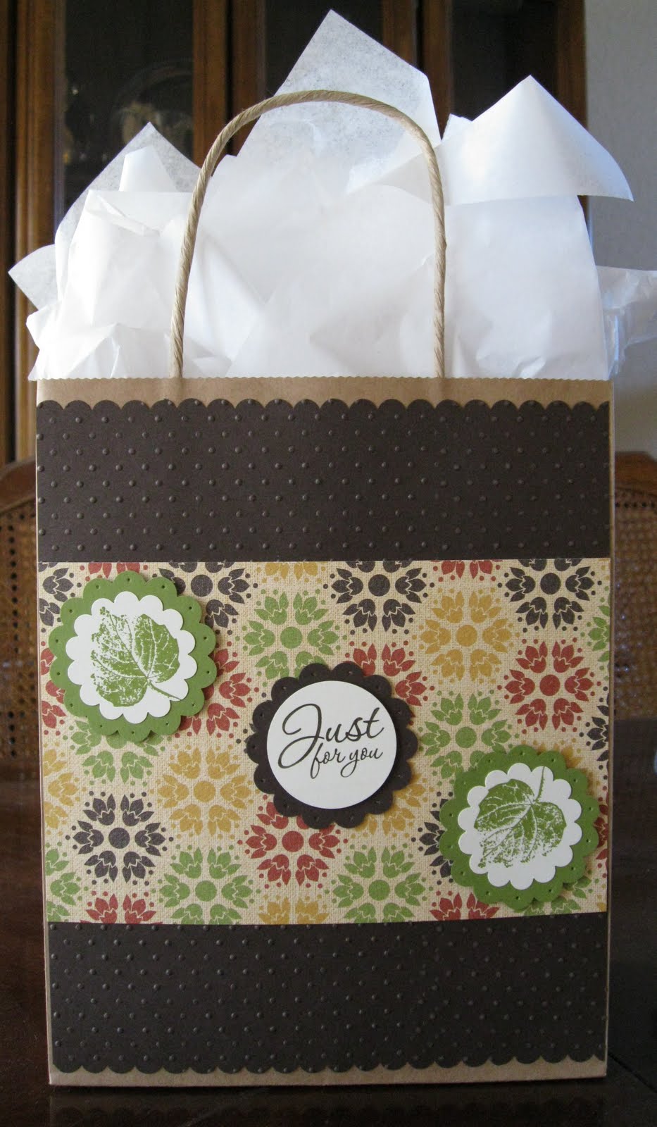 Today’s post is a bag I decorated with cardstock and our designer series paper Autumn Spice. I love this paper and the fact that it is a heavyweight paper. I ran my pieces of Early Espresso through my Big Shot using the Perfect Polka dots embossing folder. My leaves were stamped with the French Foilage stamp set and my sentiment came from the set Afterthoughts which is a level 1 hostess set. I used my Early Espresso marker instead of an inkpad because there were more words on the stamp but I just wanted, Just for you. It really made a plain bag very decorative and it didn’t take long at all. Thanks for stopping by!