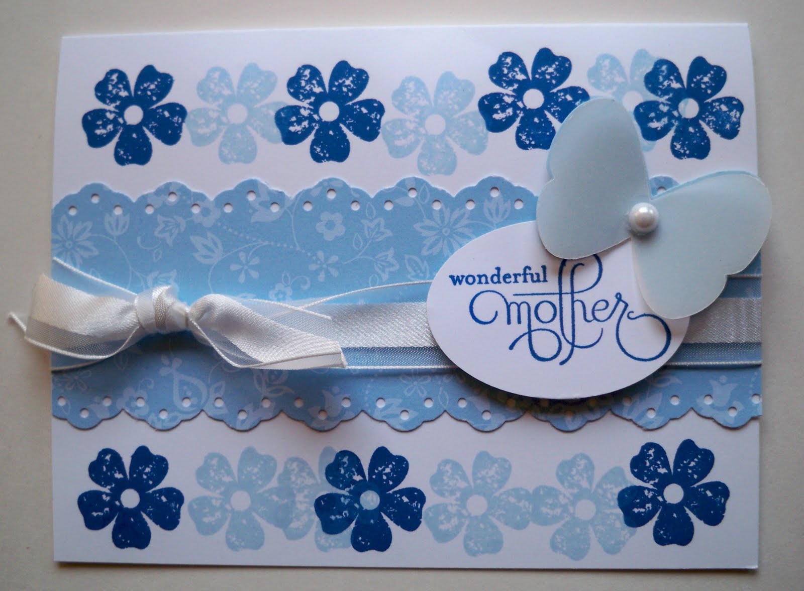 I made this card using Vintage Vogue from the Occasions Mini. (Don’t forget that this catalog is only good until April 30th and then we will have a brand new one!) I also used the Butterfly punch – for the bottom one (not sure if you can see it), I used Bashful Blue and for the one on top I used our cardstock vellum. After I made this I thought that the vellum butterfly would look really pretty if it were run through the Big Shot. I will post another one showing that look which is really beautiful. I used a half pearl from the Pretties Kit for the center of the butterfly and used a glue dot to adhere it. The paper is our Designer Series paper in Bashful Blue. This paper is also two sided as all of our other papers. Thank you for stopping by and hope you are having a great weekend!