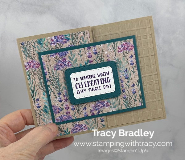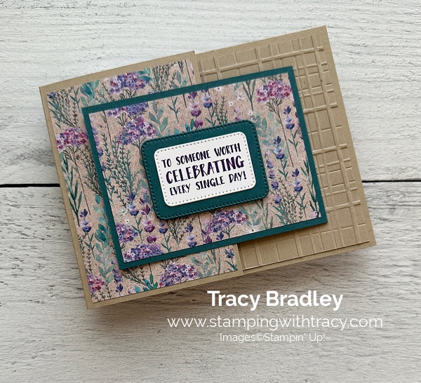 The fun fold card I’m sharing with you today was made using the Right Words Stamp Set, Perennial Lavender Designer Series Paper, Nested Essentials Dies and the Forever Plaid 3D Embossing Folder. Purple is my favorite color so you can imagine I love Perennial Lavender Designer Series Paper!
