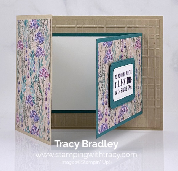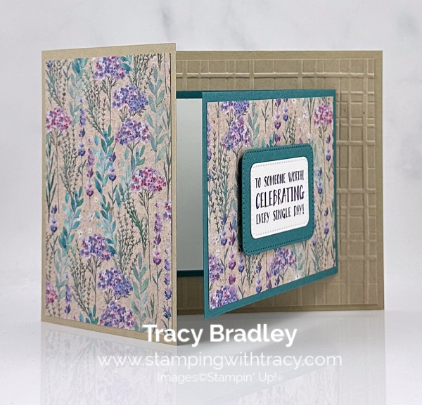 I cut a piece of Pretty Peacock cardstock and scored it in the middle. I cut two pieces of Perennial Lavender Designer Series Paper and adhered one to the outside panel and another one to the front of Pretty Peacock cardstock (when you have the Pretty Peacock cardstock laid out, it will go on the left side). I then adhered the Pretty Peacock cardstock to the inside of the card making sure the flap is on the outside of the card.