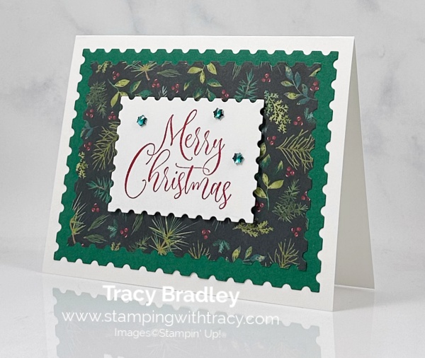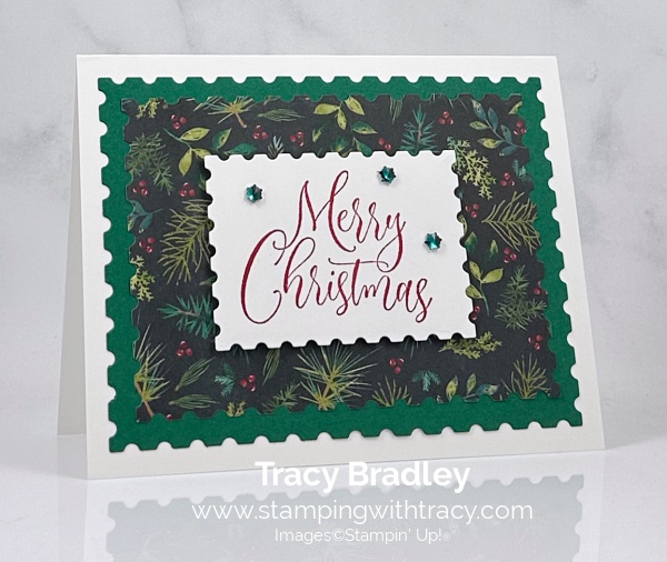 The card I’m sharing with you today was made using the Ornamental Christmas stamp set (an Online Exclusive), Elegant Pine Snowflakes Designer Series Paper (an Online Exclusive), Perennial Postage Dies and Faceted Snowflakes (an Online Exclusive).This is the same layout that I used on Wednesday and you can see that card here. The Elegant Pine Snowflakes Designer Series Paper and the Faceted Snowflakes are part of the Elegant Pine Snowflakes Suite Collection and you can see it here.