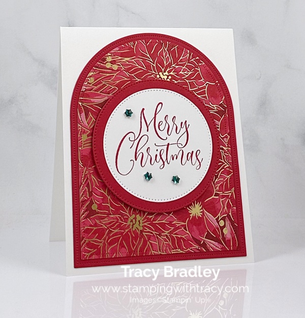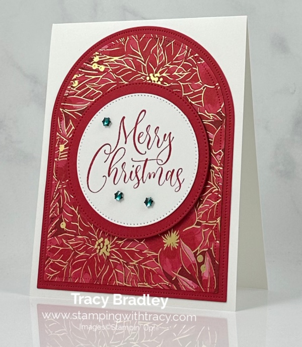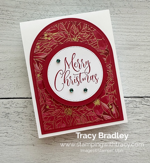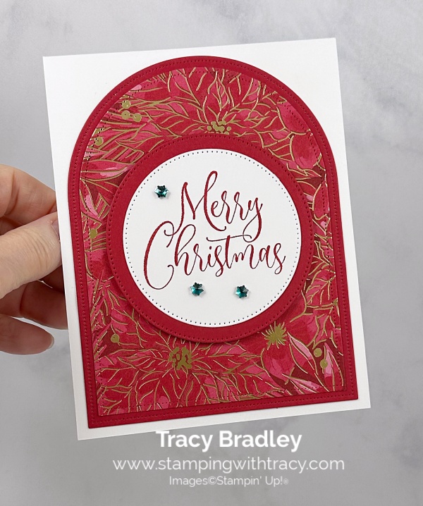 Today, I’m showcasing a card I made with the Traditions of Christmas Specialty Designer Series Paper, the Ornamental Christmas stamp set (an Online Exclusive), Everyday Arches Dies (an Online Exclusive and on the Low Inventory List), Stylish Shapes Dies and the Faceted Snowflakes (an Online Exclusive).