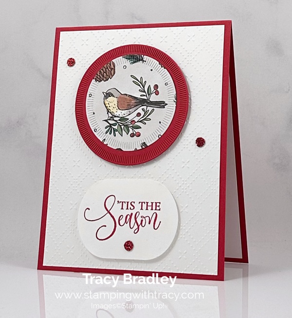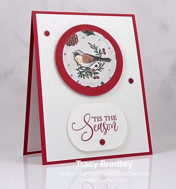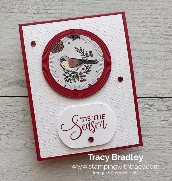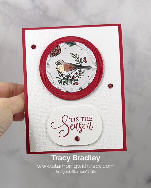The card I’m sharing with you today was made with the Traditional Labels Bundle, Traditions of Christmas Specialty Designer Series Paper, Peaceful Greenery 3D Embossing Folder and Traditional Sparkling Sequins. You can see another card using this same layout, from September here.