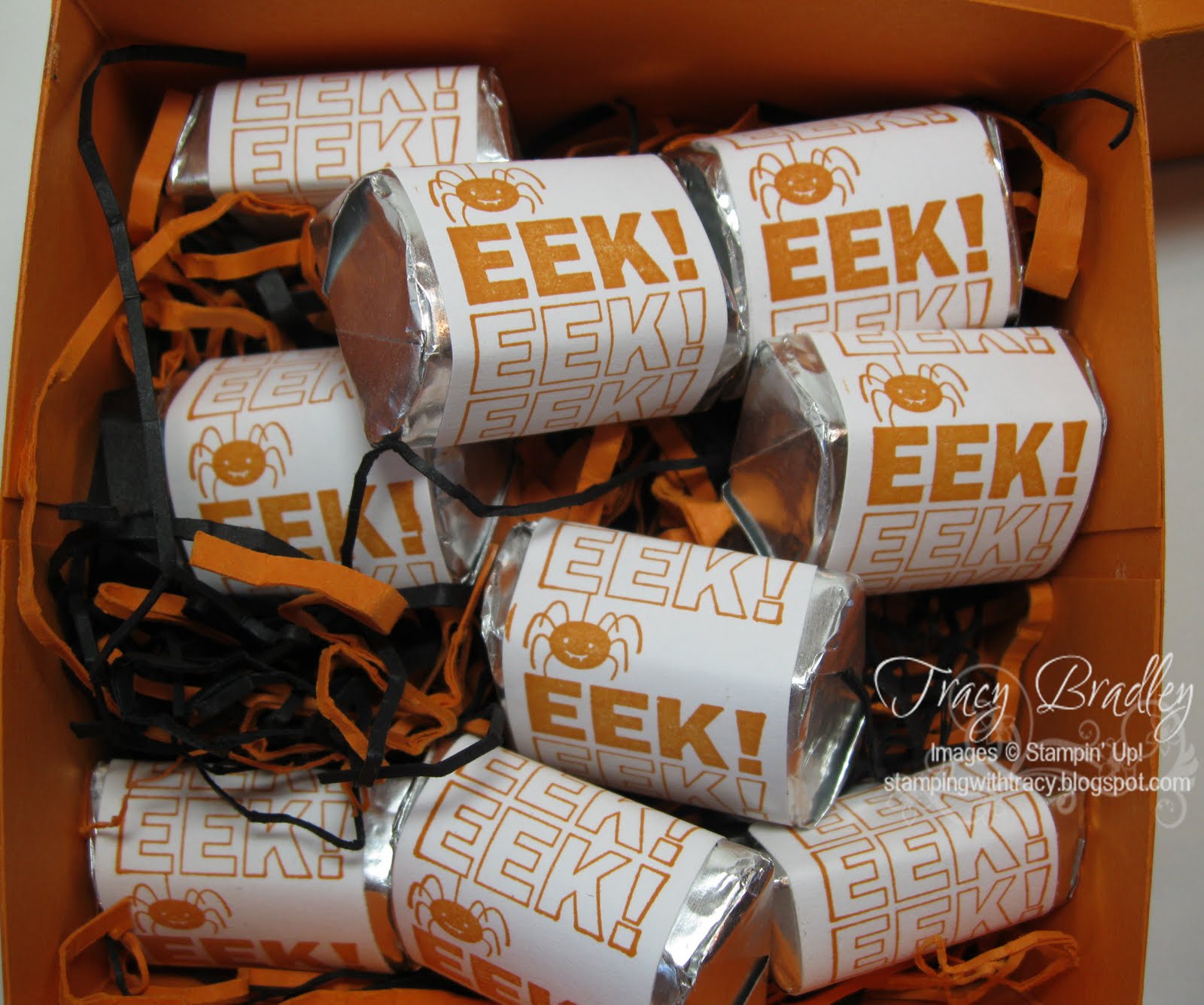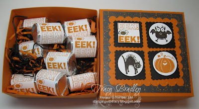 For my next project I made a box using It’s a Wrap Holidays and Batty for You to decorate the outside. I used address labels to stamp EEK! and wrapped them around chocolate which are inside the box. I have to admit that quite a few pieces of chocolate were consumed while wrapping the chocolate! My box base and top are made out of Pumpkin Pie cardstock. I used a piece of Pick Your Poison DSP, also from the Holiday Mini. The scallop is one of our Big Shot dies called Scallop Squares Duo. The cute bat, pumpkin, cat and EEK are sitting on a piece I punched out with the Postage Stamp punch. Below you can see a picture of the top and bottom, side by side.