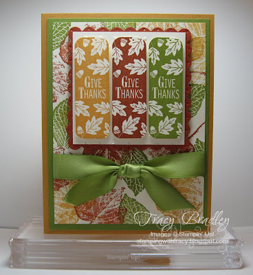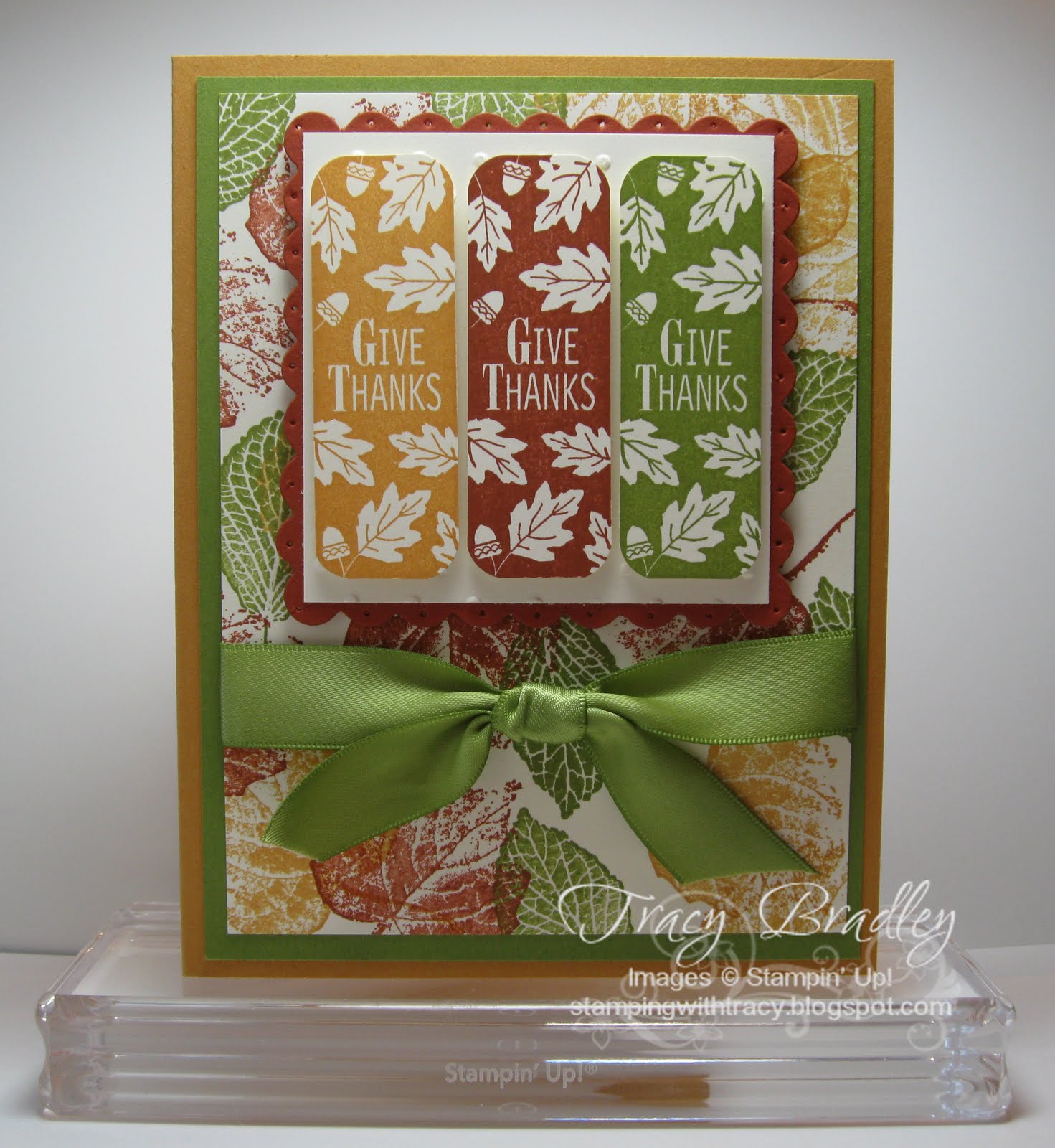 I love the colors in this card because they make me feel as though Fall is almost here! First, I made my own DSP by using Cajun Craze, More Mustard and Old Olive to stamp leaves from the set French Foliage. I stamped “Give Thanks” on Very Vanilla cardstock, cut them out and used my corner rounder on each of the corners. I popped them up with dimensionals and finished the card with a piece of Old Olive satin ribbon.