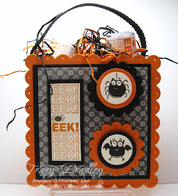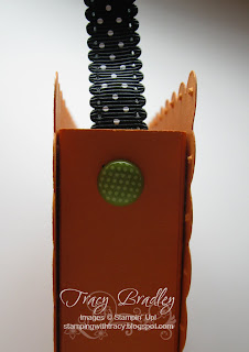 I originally saw this style of box on Angie Juda’s blog using the smaller scallop that I used on my previous box. I played around with it and came up with this bigger sized one. The bigger the box, the more candy you can put in it!! I used another piece of DSP from Pick Your Poison. For my shredded material, I thinly cut Pumpkin Pie and Basic Black cardstock and then scrunched it up into a ball. You could also put it through your paper crimper. My purse handle is our new Scallop Dots ribbon attached with a Designer Printed Brad.