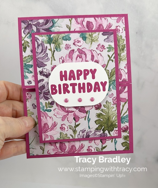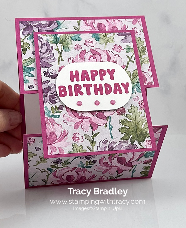 The fun fold card I’m sharing with you today was made using the Pattern of Friendship stamp set (an Online Exclusive) Floral Charm Designer Series Paper (an Online Exclusive) the Modern Oval Punch and Charming Shimmer Faceted Dots (an Online Exclusive).