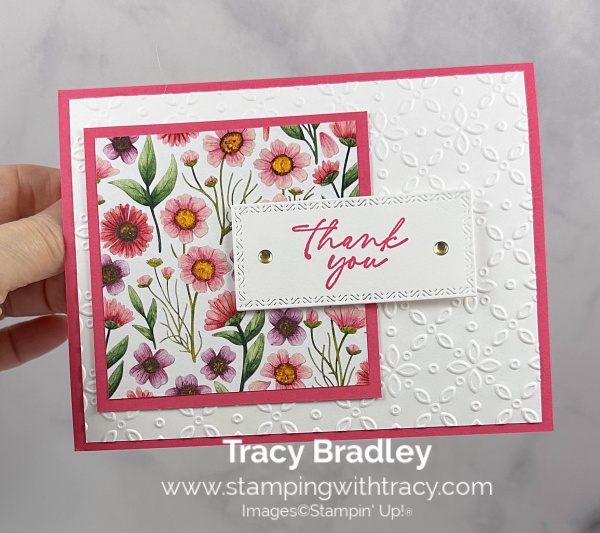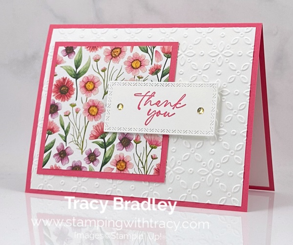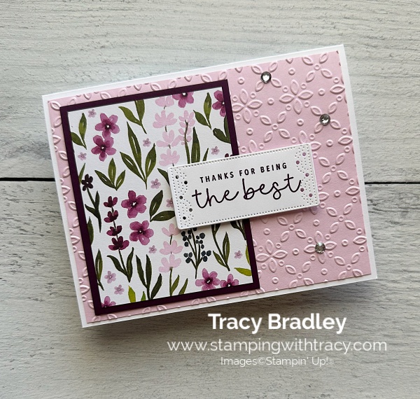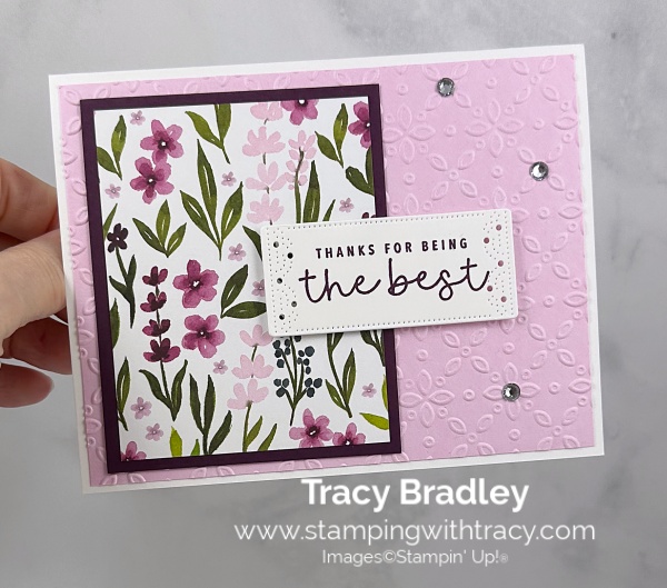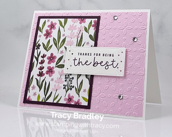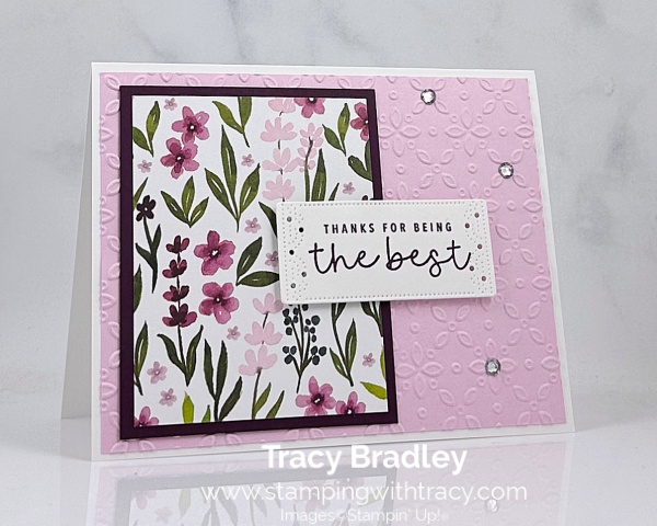 The card I’m sharing with you today was made using the Pattern of Friendship Stamp Set (an Online Exclusive), Florals in Bloom Designer Series Paper, Sentimental Framing Dies (an Online Exclusive), Eyelet 3D Embossing Folder and Rhinestone Basic Jewels.