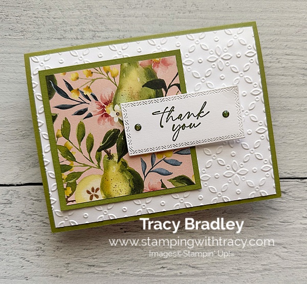 I’m sharing two cards today that use the same layout as my card on Tuesday. You can see Tuesday’s card, here. I changed the Designer Series Paper and the embossing folder. On the first card, I used Painterly Pears Designer Series Paper (an Online Exclusive) and Low Profile Sparkle Dots (an Online Exclusive). On the second card I used Floral Impressions Designer Series Paper (an Online Exclusive) and Low Profile Dots (an Online Exclusive). With both of the cards I used the Textured Notes Bundle (an Online Exclusive) and the Eyelet 3D Embossing Folder.