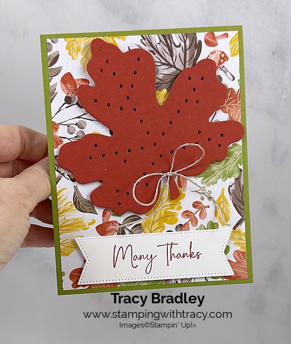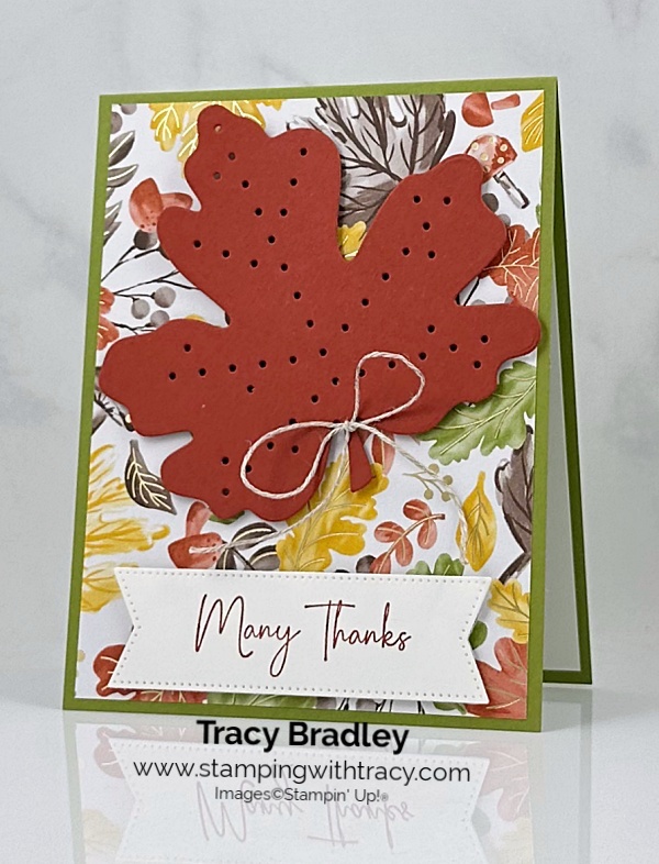 I used the Gathering Moments Dies to cut a piece of Cajun Craze cardstock for my leaf. I used Linen Thread to tie a bow and attached it to the stem using Multipurpose Glue. I then, added Stampin’ Dimensionals to the leaf and attached it to the Designer Series Paper.