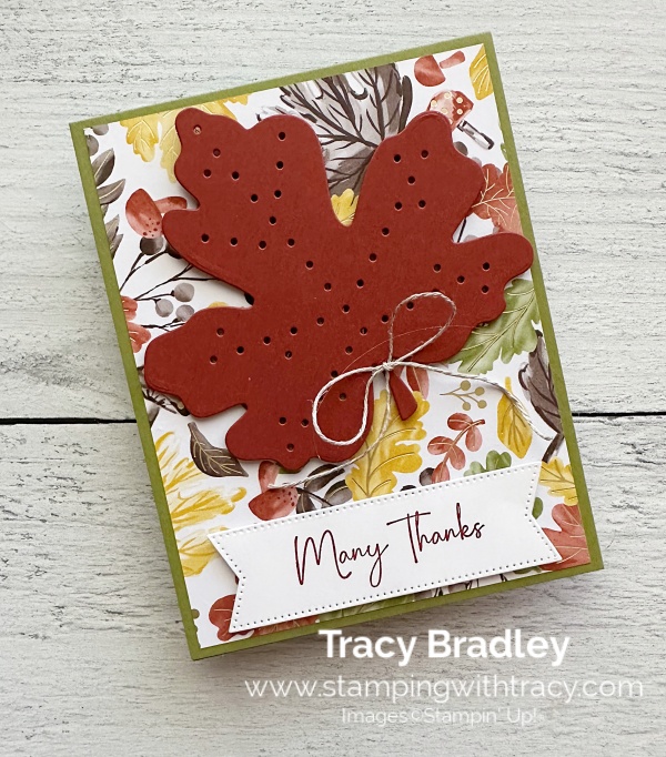 I stamped the sentiment onto Basic White cardstock using the Gathering Moments Stamp Set and used Cajun Craze ink. I cut the sentiment out using the Stylish Shapes Dies. I added Stampin’ Dimensionals to the back and adhered it below the leaf.