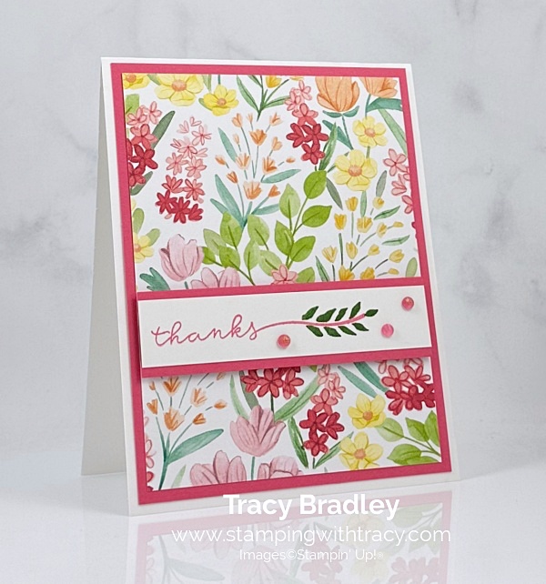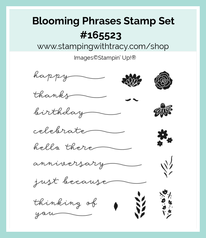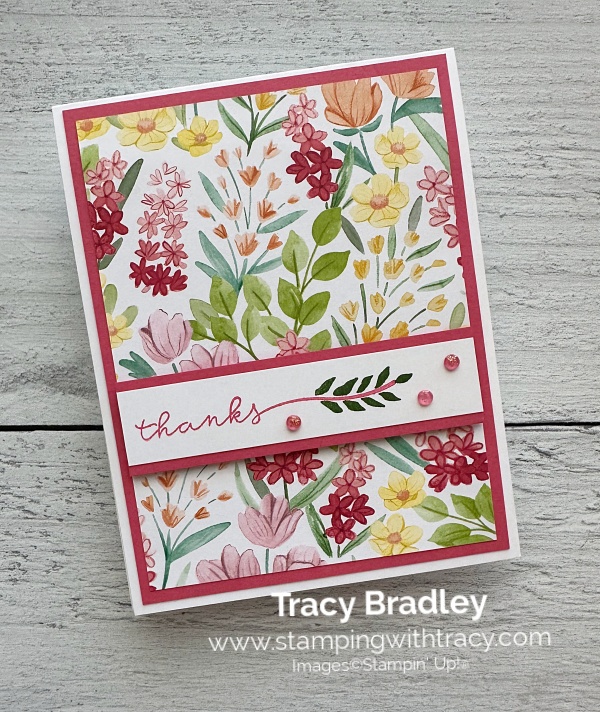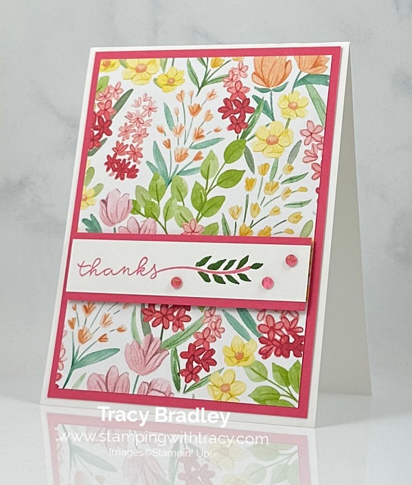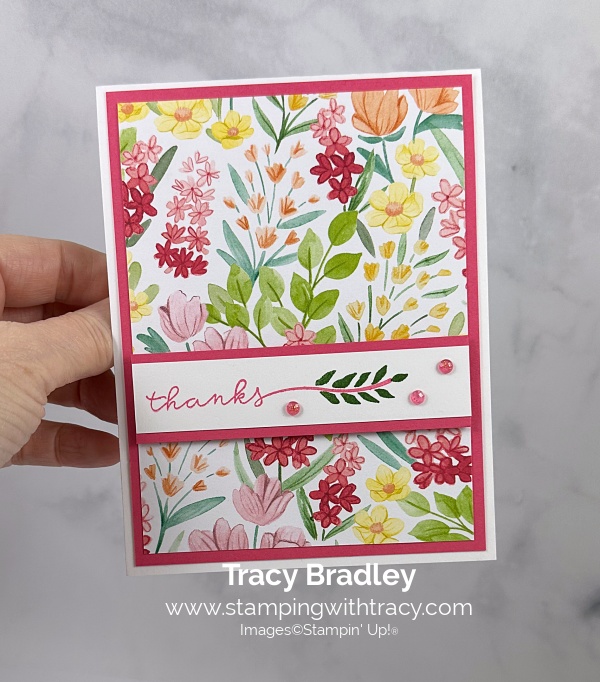 The card I’m sharing with you today was made using the Blooming Phrases Stamp Set (an Online Exclusive), Florals in Bloom Designer Series Paper, and Strawberry Slush & Pretty in Pink Gems (an Online Exclusive).
