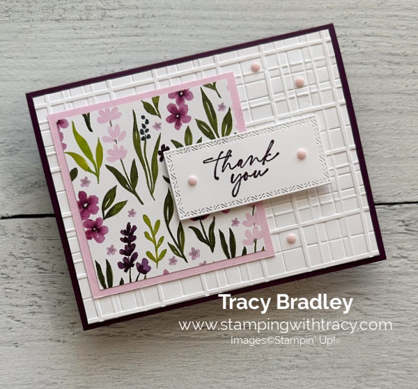 I started with a piece of Blackberry Bliss cardstock for the base of my card. Then, I embossed a piece of Basic White cardstock using the Forever Plaid 3D Embossing Folder and my Stampin’ Cut & Emboss Machine. I adhered the embossed cardstock to the front of the card.