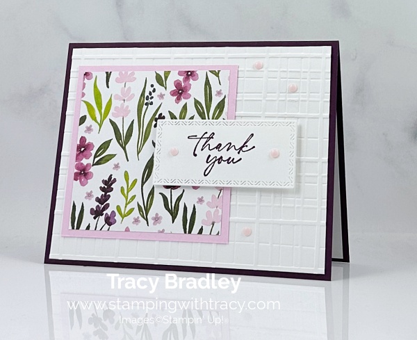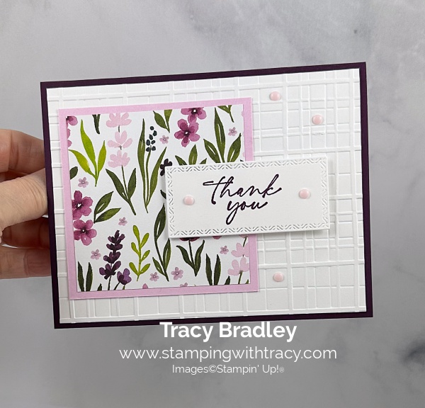 I’m sharing two cards today that use the same layout as my card on Tuesday. You can see Tuesday’s card, here. I changed the Designer Series Paper and the embossing folder. On the first card, I used Painterly Pears Designer Series Paper (an Online Exclusive) and Low Profile Sparkle Dots (an Online Exclusive). On the second card I used Floral Impressions Designer Series Paper (an Online Exclusive) and Low Profile Dots (an Online Exclusive). With both of the cards I used the Textured Notes Bundle (an Online Exclusive) and the Eyelet 3D Embossing Folder.