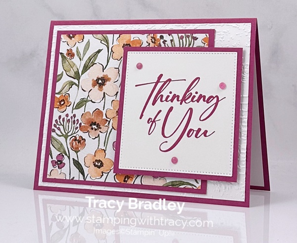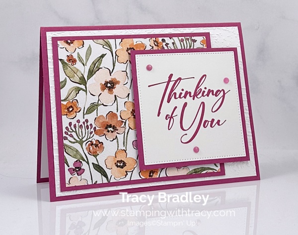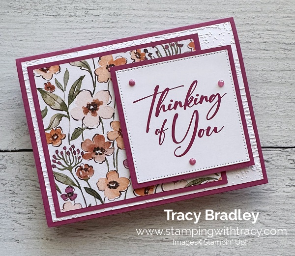The card I’m sharing with you today was made using the Sentimental Framing Stamp Set, Floral Charm Designer Series Paper, Stylish Shapes Dies, Exposed Brick 3D Embossing Folder and Charming Shimmer Faceted Dots.