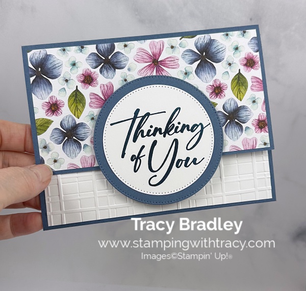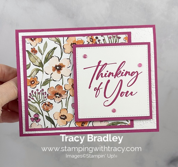 The card I’m sharing with you today was made using new Online Exclusives coming July 1, 2025. They are Label Me Grateful Dies #166111 (these dies are also packaged in a bundle with a stamp set #166112 – when you purchase a bundle, you’ll always save 10%), Floral Charm Designer Series Paper #166125 and Charming Shimmer Faceted Dots #166139. The current product I used was the With You in Mind stamp set (this is an Online Exclusive but you can see it on page 37 in the new Annual Catalog).