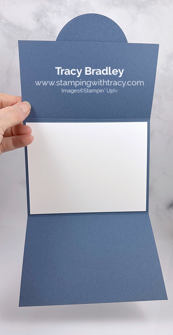 I started with a piece of Misty Moonlight cardstock and scored it in two places to create the fun fold (you can find all the measurements I used below the Supply List). Next, I added a piece of Floral Impressions Designer Series Paper to the front flap.