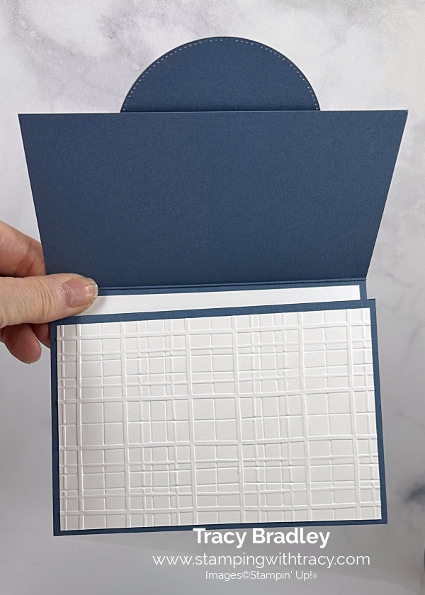 I embossed a piece of Basic White cardstock using the Forever Plaid 3D Embossing Folder and my Stampin’ Cut & Emboss Machine. I adhered it to the inside flap. I also adhered a piece of Basic White to the inside of the card.