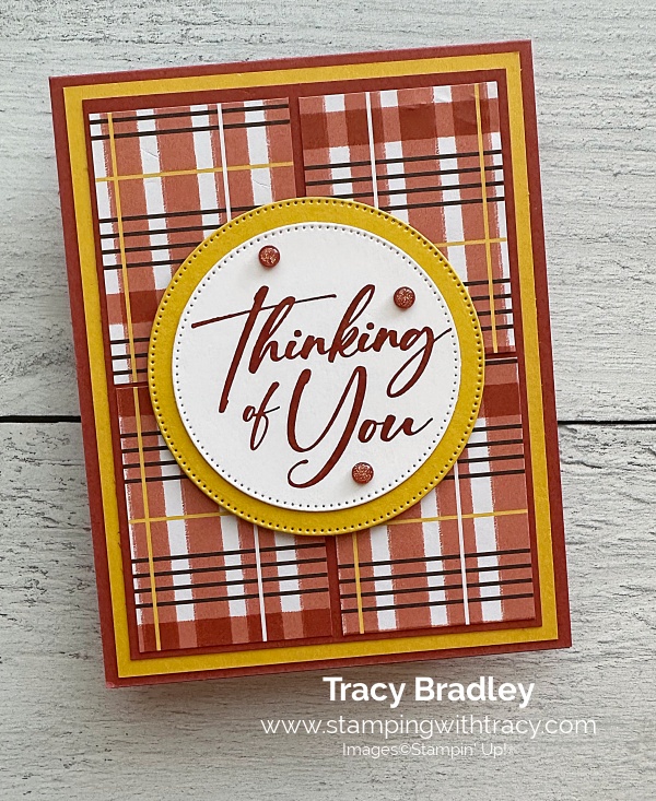 The card I’m sharing with you today was made using the Sentimental Framing Stamp Set (an Online Exclusive), Gathering Together Specialty Designer Series Paper (an Online Exclusive), Stylish Shapes Dies and Cajun Craze & Gold Dots (an Online Exclusive).