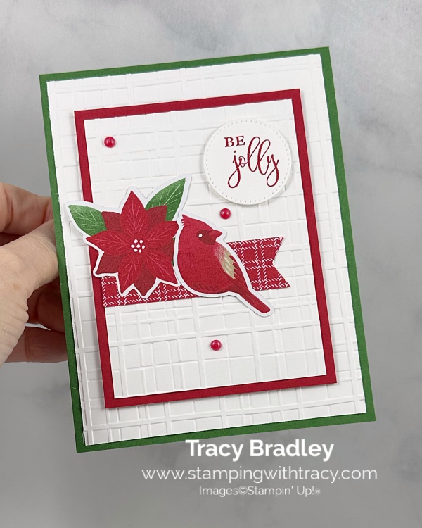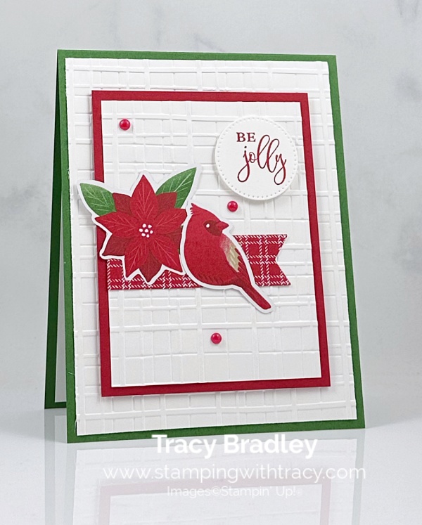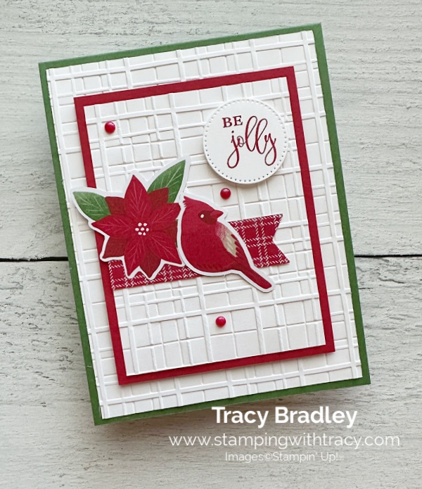 I layered a piece of Basic White cardstock onto a piece of Real Red cardstock after I embossed it using Forever Plaid 3D Embossing Folder. I added Stampin’ Dimensionals to the back and adhered it to the front of the card.