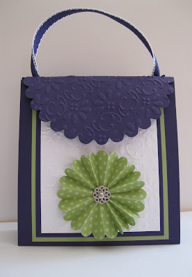 This is a little purse we made at my Big Shot Class. It is pretty easy to make and I think it turned out so cute. I used two cellophane bags on the inside and made some 3 x 3 cards. You could also put a gift card on one side too! My inspiration for this bag came from Sandy Hancock’s site. She has great directions there too! I also made a Halloween bag that I will post later today or tomorrow. If you have any questions, please don’t hesitate to email me!
