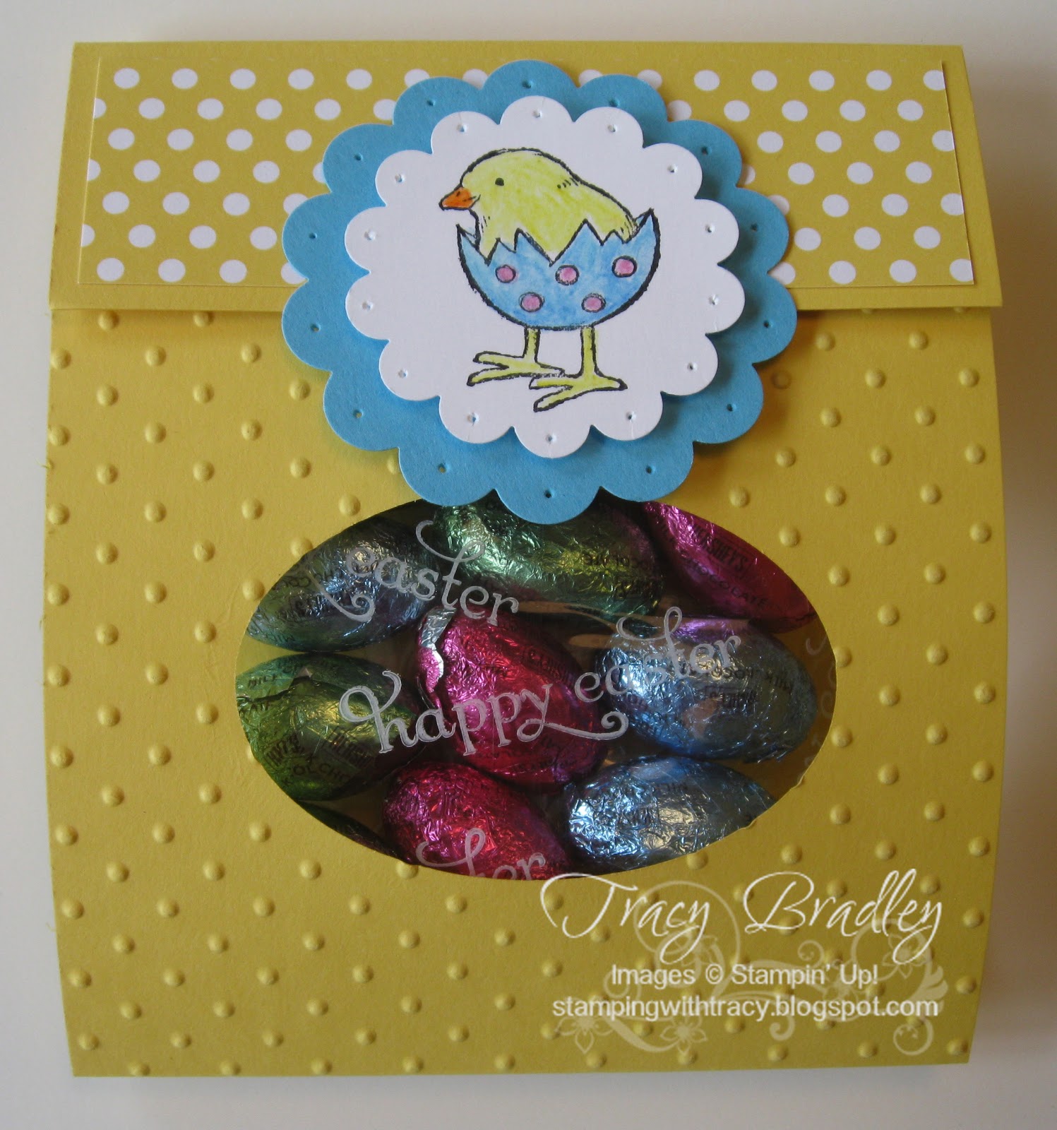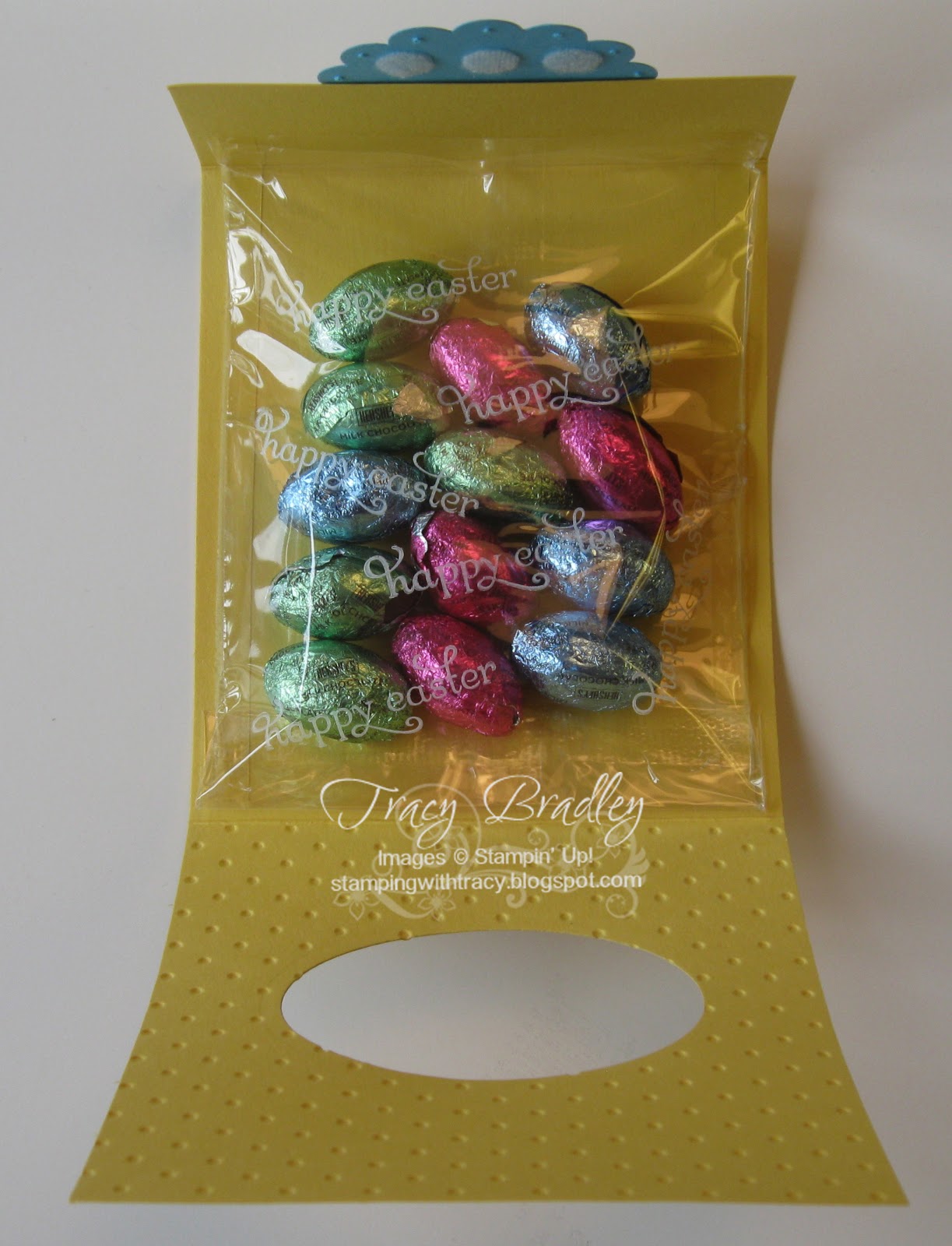 We made this cute little treat holder at my Stamp Clubs this month. I used a half sheet of 8 1/2 x 11 cardstock (4 1/2 x 11). I scored it at 1 1/2 and 6 1/2 inches. Before embossing the front, I used one of the ovals from the Ovals Collection Framelits to cut out the front. I stamped the front of the cello bag with StazOn Opaque (white). It dries pretty quickly and adds such a nice finishing touch to the project. I attached small velcro dots, which I bought at a local hardware store, to the 2 3/8 Scallop Oval. Once I shut it, the other half of the Velcro was exactly where I wanted it! The trick is to put your candy inside FIRST before you attach the velcro. I did it the other way around the first time and it wouldn’t shut properly. I hope this inspires you to give it a try!