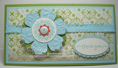 I used Lucky Limeade and Pool Party cardstock for the base of my card and my flowers. After punching my flowers out with the new Blossom Punch, I ran them through the Big Shot and the Finial Press embossing folder. The center of my flower was stamped in Pool Party ink with the Fresh Vintage Stamp set (another Sale-a-bration free product). The adorable brad can also be yours for free as it is included in the Everyday Enchantment Ribbon and Brad pack. “Thank you” is from one of my favorite sets called Short and Sweet.