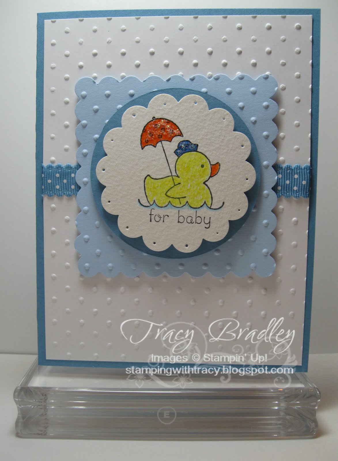 I am attending a baby shower tomorrow and made this card using a stamp set that I received when I went to Convention. It is just one of the perks of being a demonstrator and attending this once a year fun event! It is a cute set called Easy Events. It is very versatile and you can find it on page 57 in the Idea Book and Catalog. I also used Dazzling Details which is in the new Holiday Mini which goes live on September 1st. It is an iridescent glitter glue! I used it on the duck’s hat and the umbrella. It gives it just enough bling! Thank your for stopping by!!