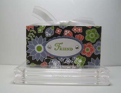 Here is a quick box you can make with your Big Shot and the Bigz XL Box #2 die. I used Berry Blossoms DSP. You only need to add a small amount of Sticky Strip and the box folds in very easily. My sentiment is from You’re a Gem stamped with Lucky Limeade Ink using the Large Oval punch. I used dimensionals and punched a Scallop Oval in Wisteria Wonder. I wrapped it with Whisper White 5/8 inch Organza ribbon, which is my favorite ribbon to use. The rhinestones add a bit of sparkle!