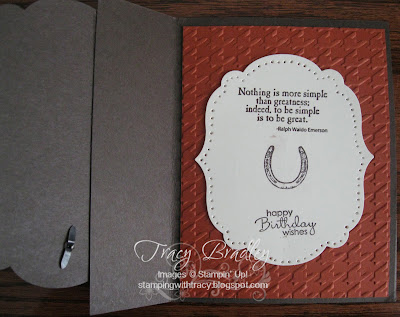 This beautiful card was made by a member of my downline, Linda Wheelock. She used the stamp set Horse Frontier which is a set that I don’t own so I’m glad that I can show you such a gorgeous card using it. Linda used a new Designer Series paper from the Spring Catalog called Parker’s Patterns. The Labels Collection Framelits were used to frame the horse and the sentiment on the inside. She also used the Houndstooth Embossing folder. The button is the only product on her card that isn’t Stampin’ Up!