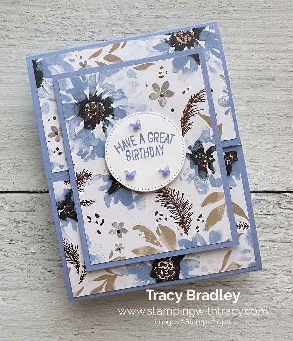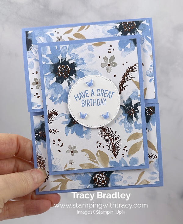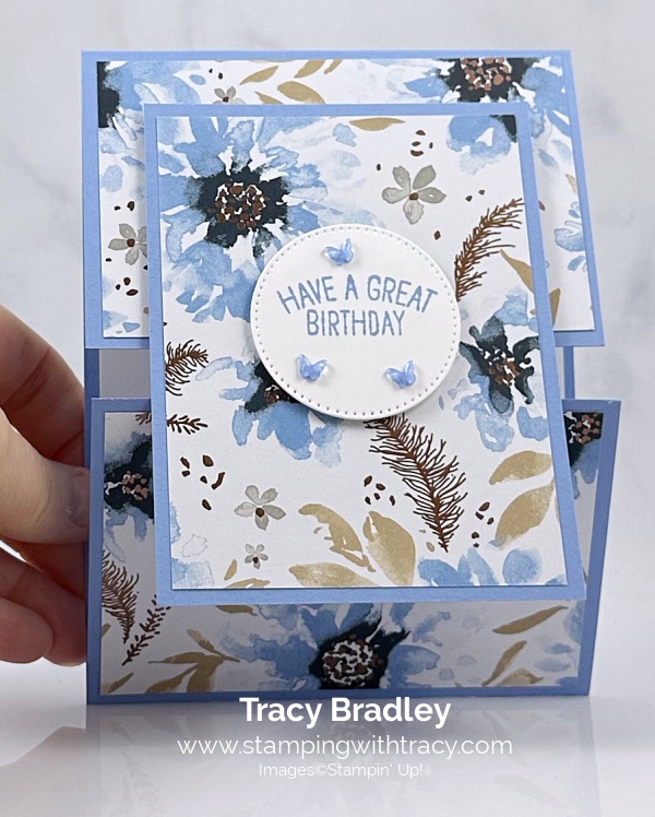 I made another fun fold today! I used a 2026-2028 In Color to make my card. Hydrangea Hue! I used the Relaxing Waterside Stamp Set #167922, Hydrangea Hue 8-1/2” x 11” cardstock #167686, Hydrangea Hue ink pad #167677 and the 2026-2028 In Color Butterflies #167656. All of these products will be available for purchase on May 5, 2026. I also used Delicate Dreams Specialty Designer Series Paper (an Online Exclusive). This Specialty Designer Series Paper has been out of stock for some time now. It is in now! I also used Stylish Shapes Dies. You can see another variation of this card, here.
